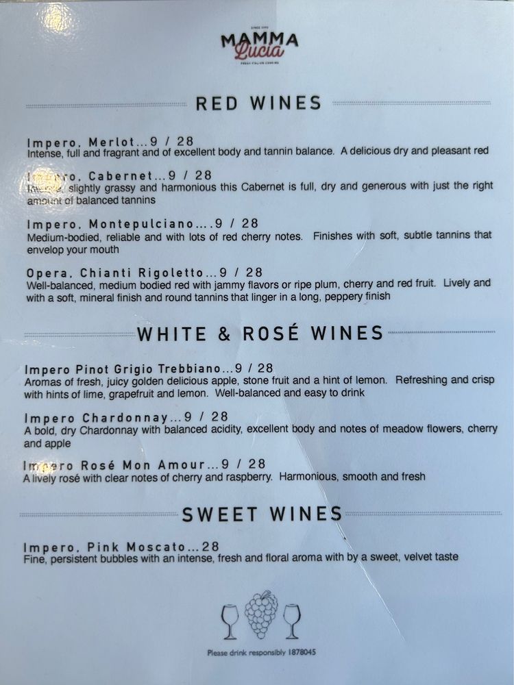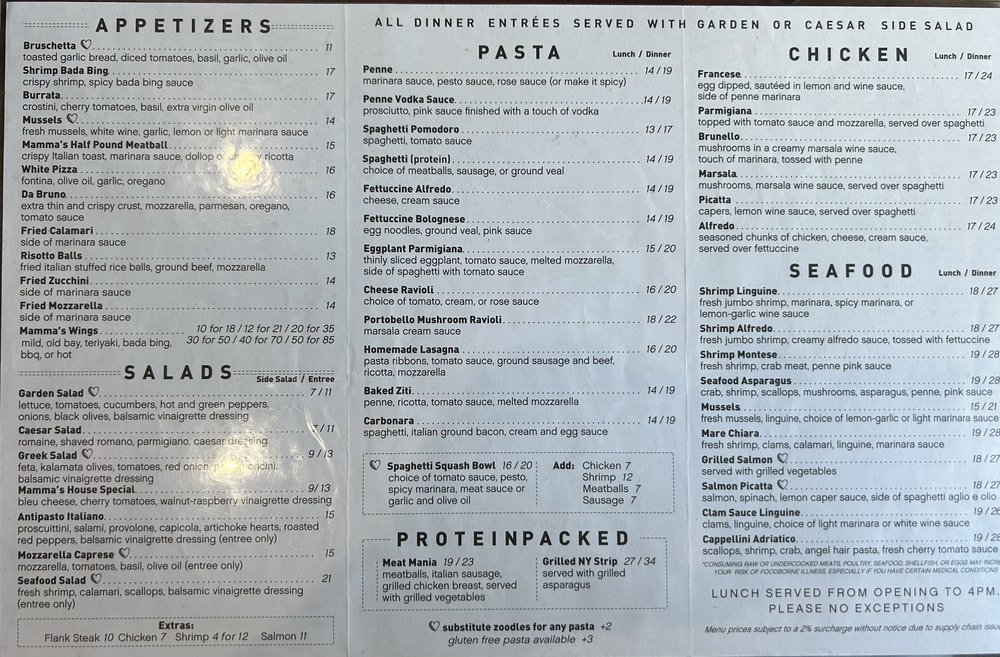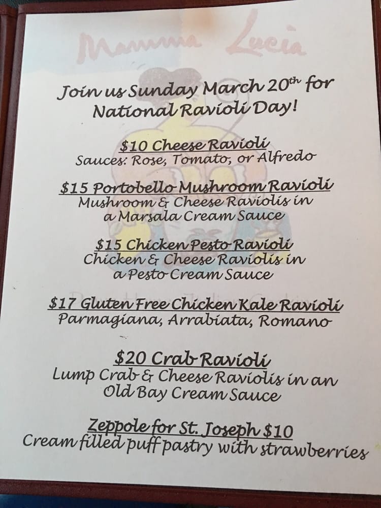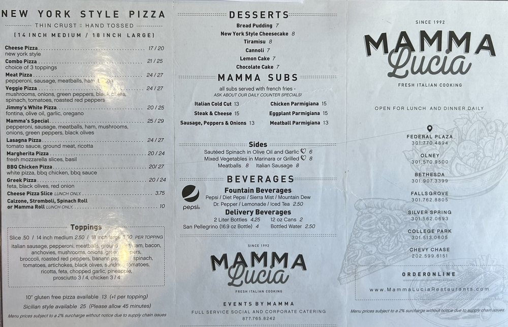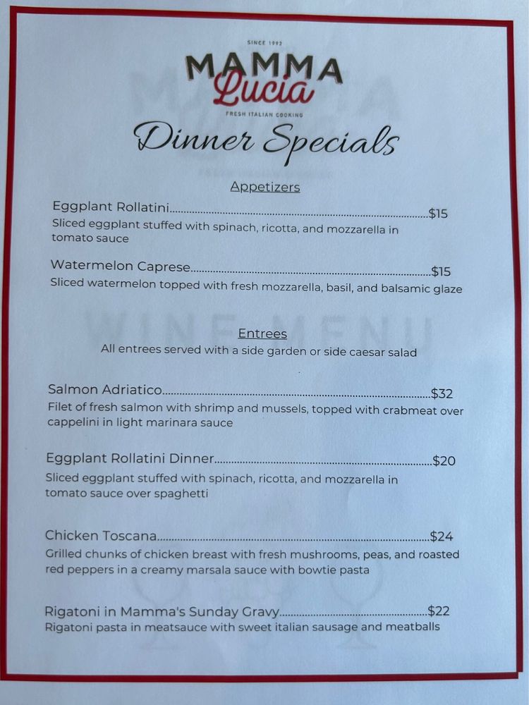 Introducing the menu at Mamma Lucia, an Italian restaurant located in Bethesda, MD, known for its diverse offerings. From classic antipasti like Calamari Fritti and Bruschetta, to hearty Zuppa options like Pasta e Fagioli and Wedding Soup, there is something for every palate. The Insalata selection boasts fresh and flavorful choices like Caesar Salad and Greek Salad. Customers rave about the exceptional service and delicious dishes, such as the Portobello Mushroom Ravioli and Chef's Special Gnocchi Trio. The generous portions and flavorful combinations, like the Seafood Asparagus pasta with pink sauce, leave diners satisfied and wanting more. For pizza lovers, the fresh toppings and crunchy crust of Mamma Lucia's slices are a must-try. Don't miss out on the delectable dishes and cozy ambiance at Mamma Lucia.